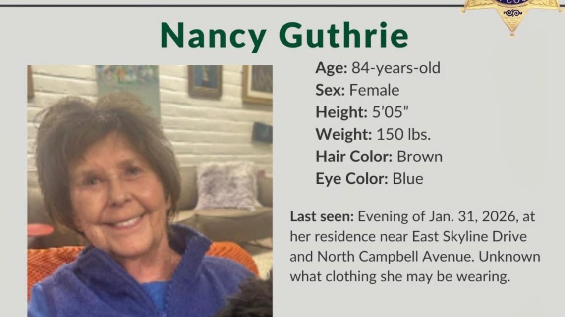 This image is provided by the Pima County Sheriff’s Department, dated Monday, Feb. 2, 2026, showcasing a missing person alert for Nancy Guthrie. (Source: Pima County Sheriff’s Department via AP)